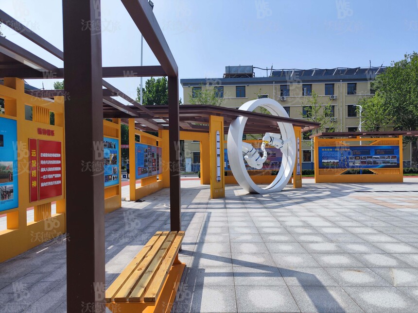 北京市士官学校景观设计 士官学校位于北京市昌平区,是培养未来优秀航空航天士官的摇篮。本项目设计范围是新建教学楼周边场地景观设计,面积约22400m²。秉持“书山学海,攀登高峰”的设计理念,通过“方圆结合,简约大气”设计手法,将部队元素、航天元素、艺术造型等融入铺装、植物搭配、景观小品的设计中。整个设计集景观功能和使用功能于一体,既满足部队军事办公,军事训练,综合服务,文化休闲等功能,又打造了良好的景观环境。 中心广场铺装面积约7500㎡,线条简洁,颜色朴素,是官兵及学员主要的集散、聚会、训练场所,军事长廊对称分置于东南和西南角,展示部队历史和文化、学员风采,整体效果大气,庄重,整洁,威严。项目建设本着因地制宜、适地适树、经济性和可持续性原则,结合景观设计和功能需要,场地尽量保留了现状大树,并增加部分乡土树种及彩叶植物,景观上“三季有花、四季有绿”,管理上降低后期维护成本,是建设节约型园林很好的体现。 项目已于2024年7月建成落地,完美效果的呈现得到了部队领导的高度认可,也为学校后期改造建设提供了设计参考和方向。