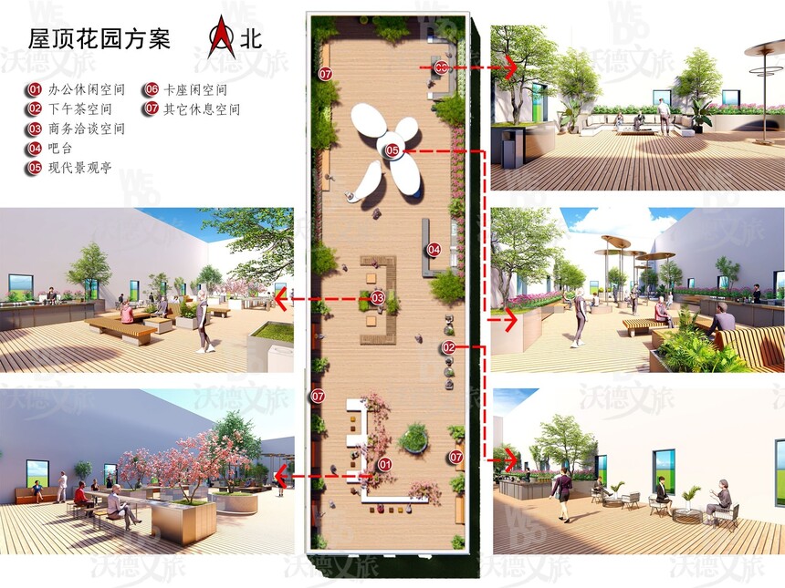 项目地位于北京市通州区,占地面积约600平方米,由沃德文旅整体设计和施工。 这处设计新颖而简洁的屋顶花园显得现代感十足,建筑顶部成长条形分布,在这个有限的空间内营造了新型社交空间。屋顶花园也是一个雨水收集器,在雨水利用方面也发挥了作用,同时还减缓了城市热岛效应。 屋顶花园主要分为:办公休闲空间、下午茶空间、商务洽谈空间、卡座休闲空间、吧台和其它休闲空间;花园内部放置有多种规格的种植箱;其中的草本植物、多年生植物、常绿灌木和多干遮荫树所组成的生态群落,极大地丰富了屋顶花园的环境。在城市的“混凝土丛林”中,大楼越建越高,空间越来越小。如果有一片绿色屋顶花园,开辟出亲近自然的一片天地,就可以为人们的工作生活环境带来一丝惬意。 屋顶花园的绿化立体而丰富,西府海棠和紫叶矮樱成为了该花园的一大看点,另外月季和福禄考也创造了一种独特的视觉效果。花园中提供了木质座椅,使得人们能够安心地享受花园时光。 在城市的“混凝土丛林”中,大楼越建越高,空间越来越小。如果有一片绿色屋顶花园,开辟出亲近自然的一片天地,就可以为人们的工作生活环境带来一丝惬意。