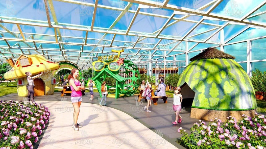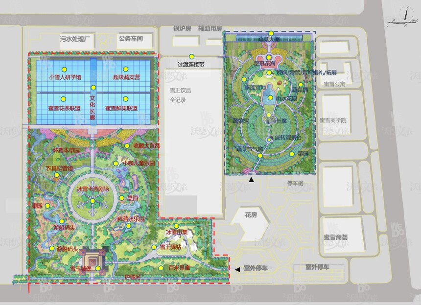 为展示企业品牌形象,并为中原城市群打造一个现代化农业休闲园区、中小学生研学实践教育基地,蜜雪冰城邀请我方共同在焦作温县打造一个品牌形象展示窗口、雪粉们的世外桃源。 项目占地面积260亩,以蜜雪冰城产品和企业文化为故事线,以生态、绿色为根基,以高科技蔬果种植采摘为特色,以雪王为园区的视觉识别系统,打造高科技农业种植、猎奇与蜜雪冰城企业文化、产品完美融合的现代农业公园。 我们围绕雪王IP打造了休闲、科普、购物及视觉识别系统,将蜜雪冰城的产品与企业文化巧妙融入其中,并融入丰富的二次消费场景和内容。 在产品上,紧紧围绕园区的使命及其服务对象,原创设计打造了六大明星体验产品: 品牌温室—蜜雪鲜果联盟、蜜雪花茶联盟; 网红自然营地—拾趣; 高标准研学基地—小雪人; 明星果园—蜜雪桃花源; 大地景观—雪王大地艺术区; 主题演出—蜜雪艺术秀; 大咖青绿营以绿色蔬菜种植和生态休闲花园打造出“雪王”的巨幅大地景观。 这里是雪王的会客基地,是蜜雪的品牌庄园,是雪粉的开心乐园,是现代农业科技示范园、中小学生的户外课堂,更是大咖的“蜜雪桃花源”。